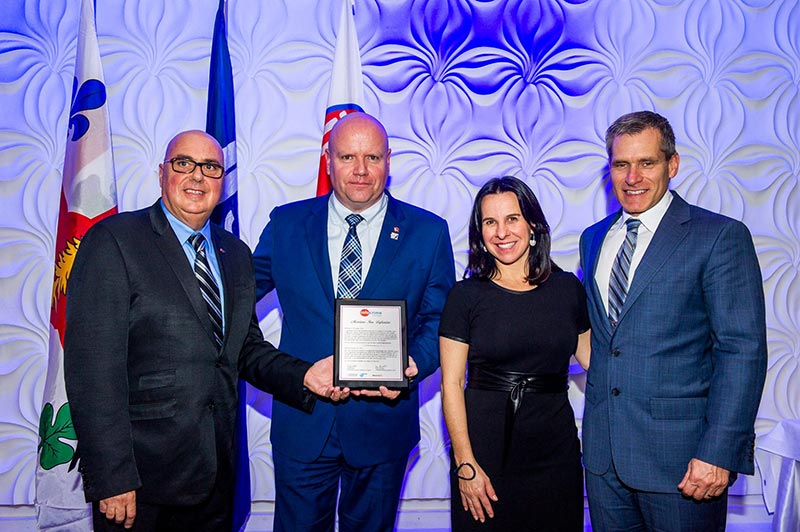 ICM President and CEO Jean Touchette, Ian Lafrenière, Guest of Honour, Mayor Valerie Plante and SPVM Director Martin Prud'homme at the official presentation of a commemorative Thank-you plaque for his service to ICM.