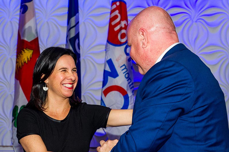 Mayor Valérie Plante received from ICM Chairman of the Board André Drolet a souvenir plaque highlighting her participation in the 2018 annual dinner with police chief Martin Prud'homme.